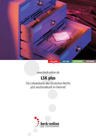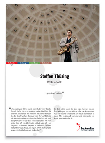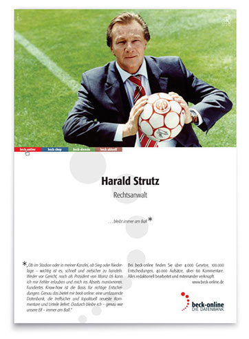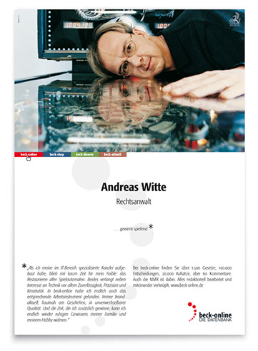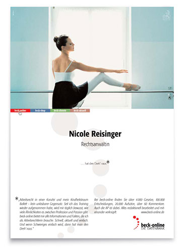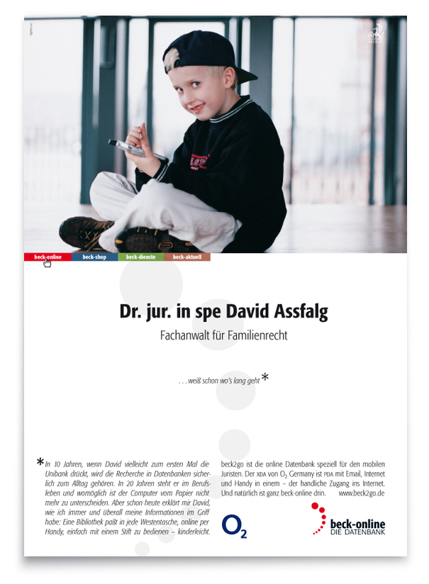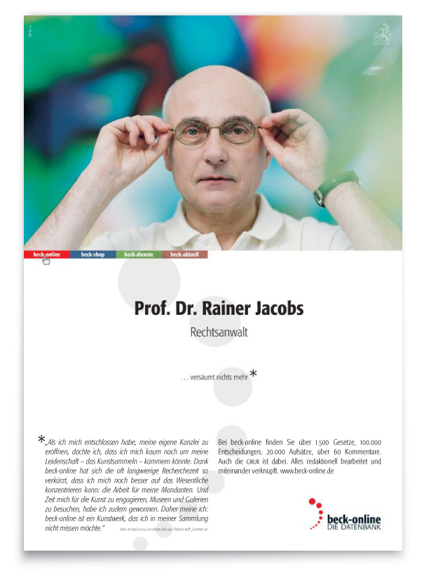 Der zweite, konzeptionell angelegte Auftrag: Kreation einer ausdrucksstarken Image-Kampagne, die diese Online-Plattform in der hauseigenen »Neuen juristischen Wochenschrift« wie in verlagsfremden Fachpublikationen werbewirksam einführt – und in einprägsamer Form protegiert.