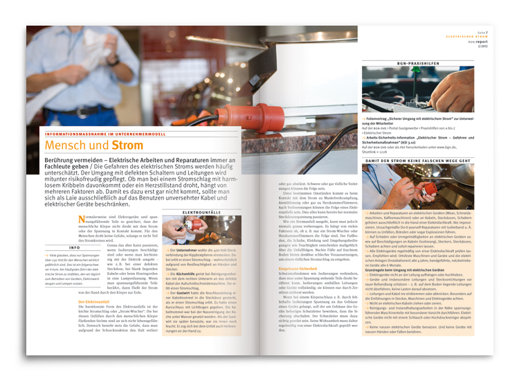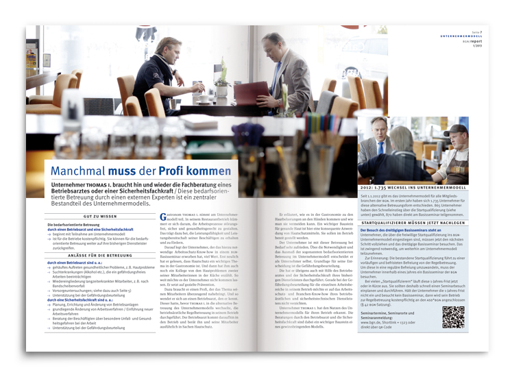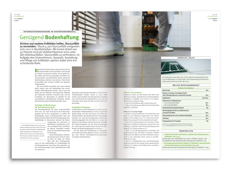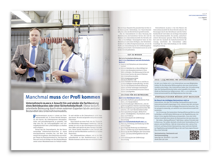 Im Prinzip das Pendant der BGN-Zeitschrift »akzente« – nur eben für Mitarbeiter in Kleinbetrieben ganz heterogener Berufssparten. Wieder mit den inhaltlichen Schwerpunkten »Prävention« und »Arbeitsschutz«. Wieder mit der gleichen Aufgabenstellung. Anno 2006 wurden wir dann auch folgerichtig mit der »report«-Gestaltung betraut.
