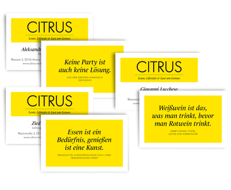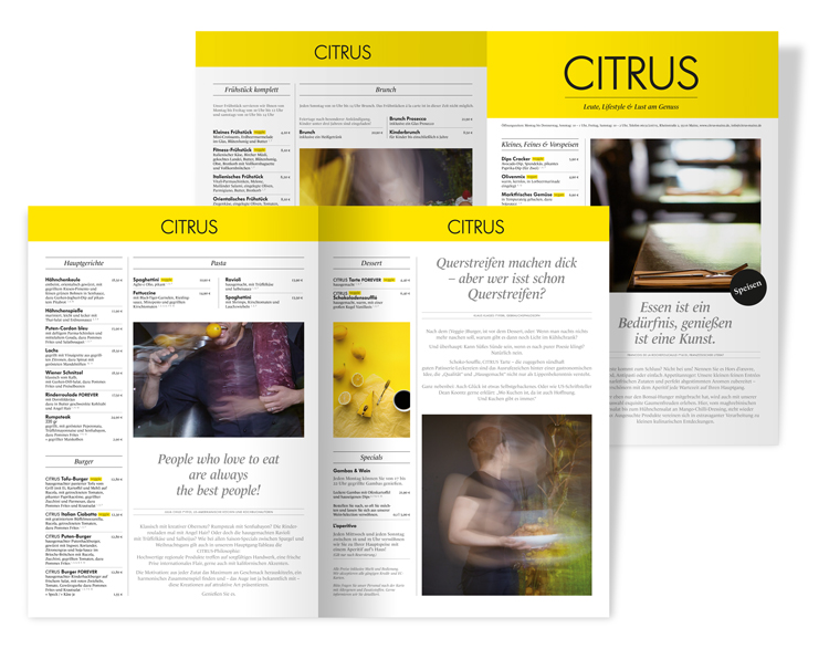 Zentrales Instrument der neuen Kommunikations-Linie: eine Citrus-frische Website, die alle inhaltlichen, ästhetischen und atmosphärischen Aspekte in einer Online-Präsenz bündelt – natürlich aufgewertet mit Fotokunst, die das Lebensgefühl hinter der Marke Citrus illustriert. Ergebnis: ein bis ins Detail stimmiges Gesamtpaket, das Auftraggeber, Mitarbeiter und Gäste rundum euphorisiert hat. Uns übrigens auch.