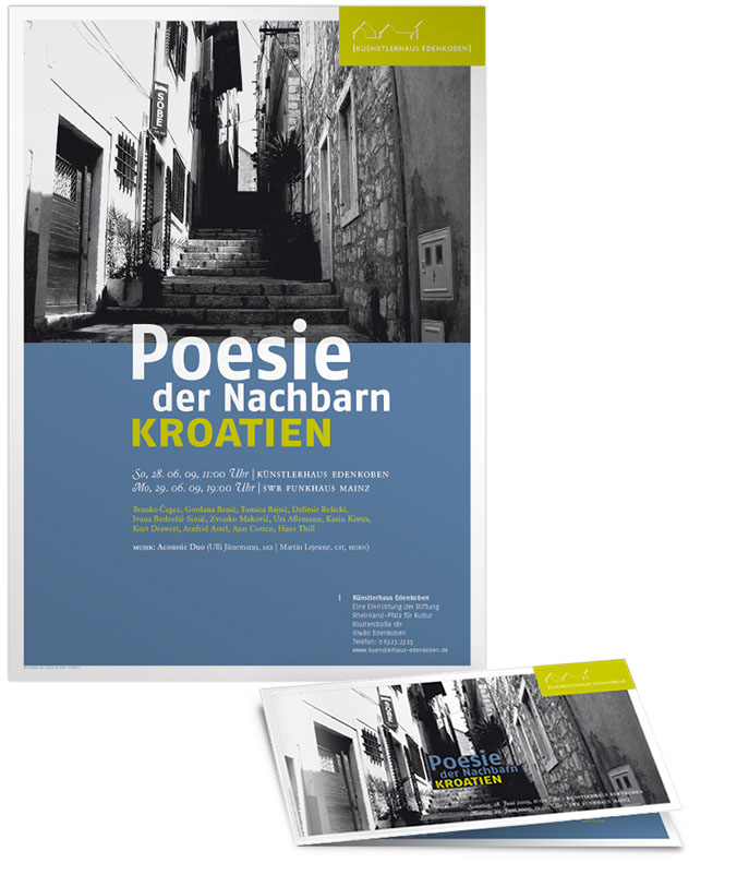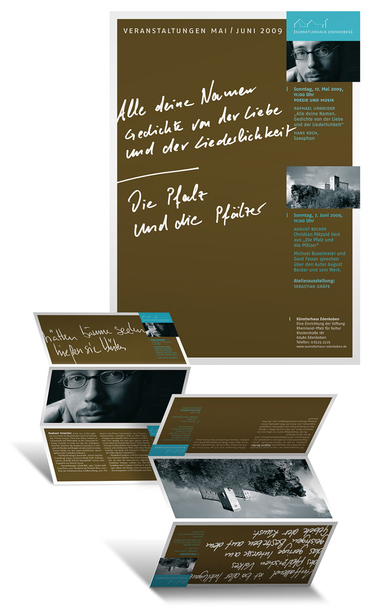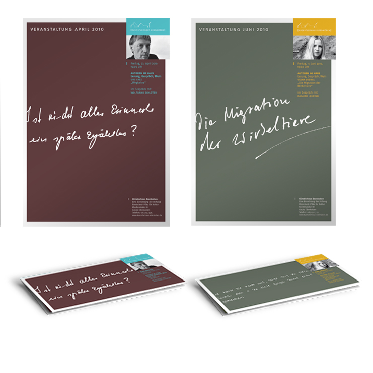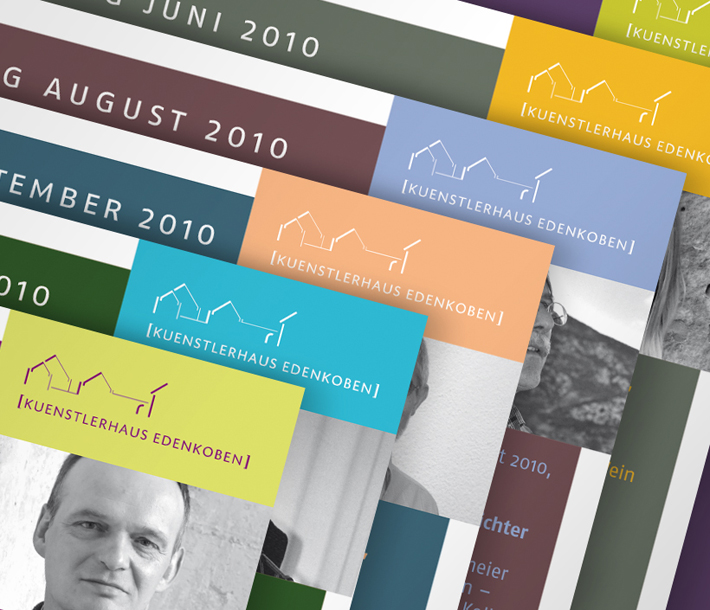 Ein anderes Low-Budget-Projekt. Die Aufgabe zunächst: eine offene Ausschreibung, quasi ohne gestalterische Vorgaben – aber mit der Maßgabe, die Bildmarke einzubinden und die qualitative Substanz der unterschiedlichsten Kultur-Angebote des »grenzüberschreitenden« Künstlerhauses in ein prägnantes Erscheinungsbild zu übersetzen.