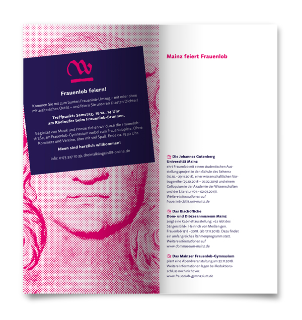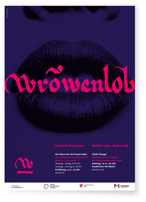 Zum 700sten Todestag des Minnesängers Heinrich von Meißen, genannt »Frauenlob« (auch: wrõwenlob, frauenlop etc.) plante der Mainzer Kunstverein Dreimalklingel e.V. eine Reihe von Veranstaltungen.