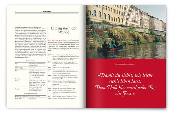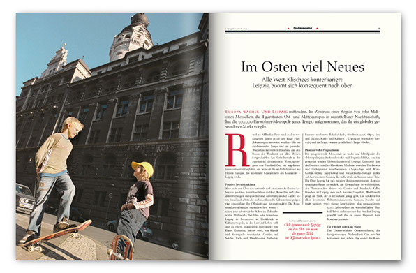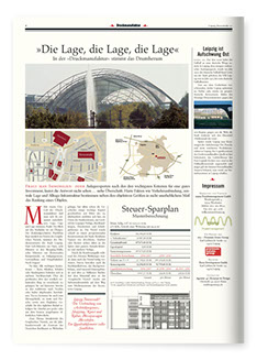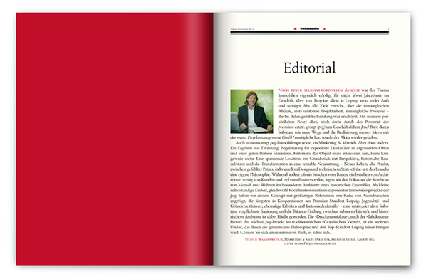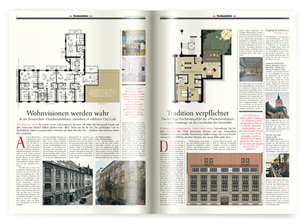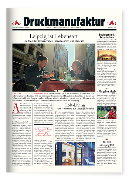 Die Idee: Wir geben eine eigene »Druckmanufaktur-Zeitung« heraus – mit klassischer Typografie, ganz realen und eben auch gezielt werblichen, von uns verfassten Artikeln, die Leipzig als Zukunfts-Boomtown zeichnen, das Immobilien-Projekt mitsamt seinen Lofts, Interieurs und architektonischen Extras journalistisch vorstellen.