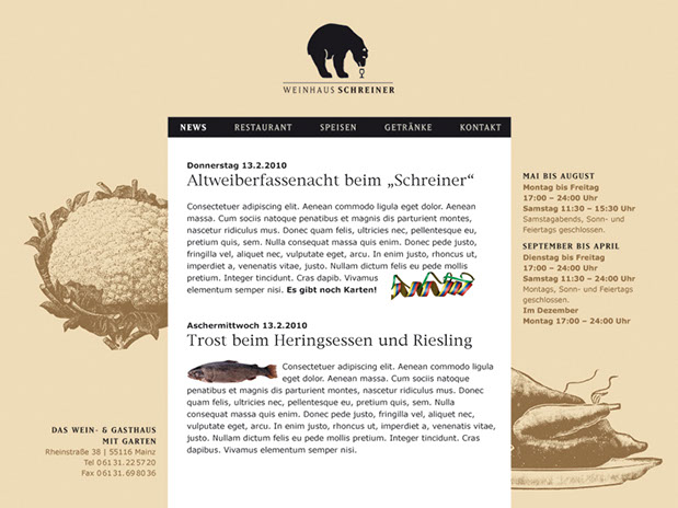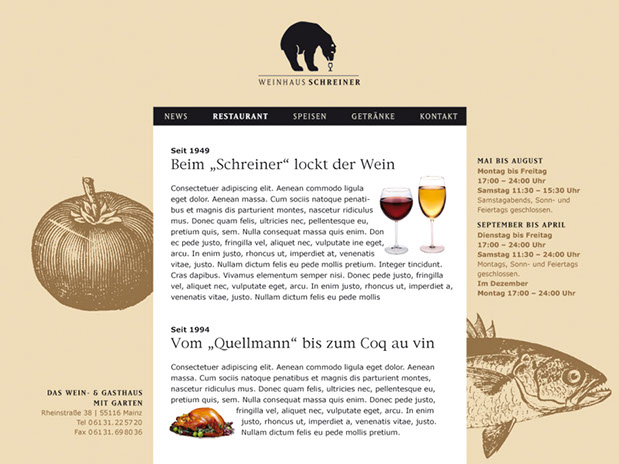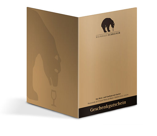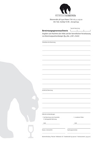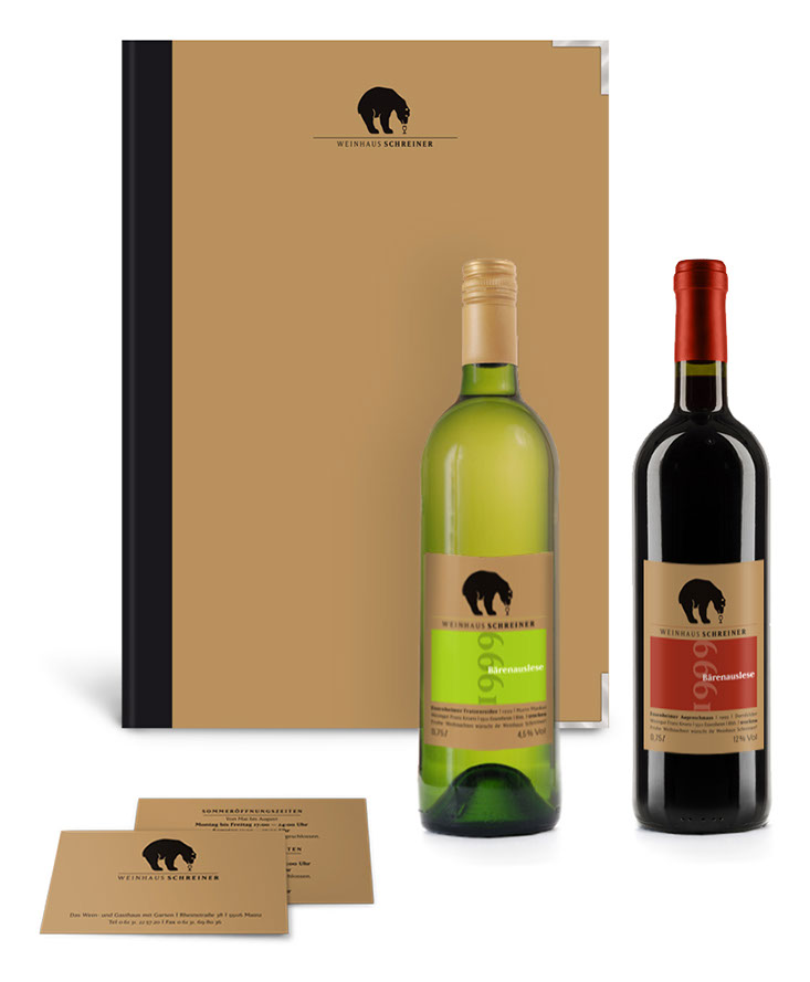 Und wie war das noch gleich mit dem Bären? Eine häufig, wenn nicht ständig gestellte Frage – die bis dato auch weder schlüssig noch abschließend beantwortet werden konnte. Ergo: Mission completed. Die Ansage des Hausherren war nämlich, ein Logo zu entwickeln, das einem alteingesessenen gutbürgerlichen Weinhaus einen originellen Blickfang und neue Aufmerksamkeit beschert. Warum also nicht mal der Mainzer Altstadt und der Institution »Schreiner« einen Riesling-liebenden Schwarz-Bären aufbinden?