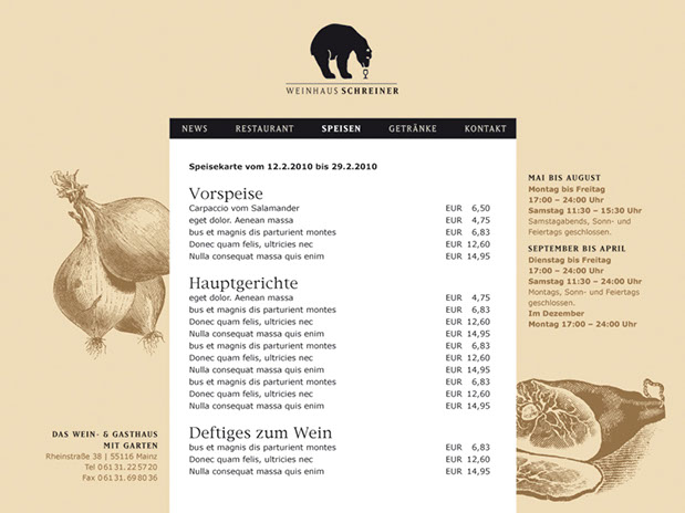 Diskutiert – getan. Das gestalterische Credo quer durch alle Kommunikationsmittel: Smarte Farben treffen auf schlichte Eleganz … und eben die geheimnisvolle Bären-Auslese. Damit ziert das neue Logo mit Meister Petz nun also die Geschäftspapiere, die Speise-, Geschenk- und Visitenkarten sowie das Etikett im Entwurf des Hausweines. Fortgeschrieben wird das Rundum-Gestaltungskonzept natürlich auch im Website-Entwurf, der Bodenständigkeit und rustikale Gemütlichkeit in einem geradlinigen Designkonzept verpackt. Mainz findet’s … »echt bärig!«.